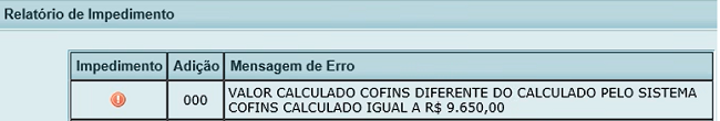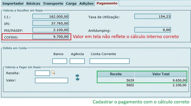 Caso o valor do pagamento informado tenha sido calculado diretamente com base em 0,97% ou 1,57%, haverá a indicação de erro impeditivo, situação na qual o importador deverá ajustar o pagamento para refletir a alíquota correta (0,965% ou 1,565%, conforme o caso).